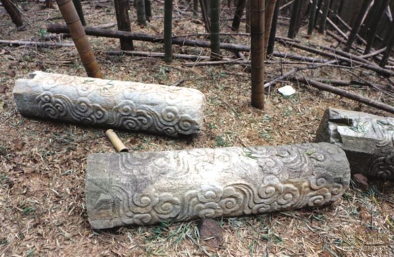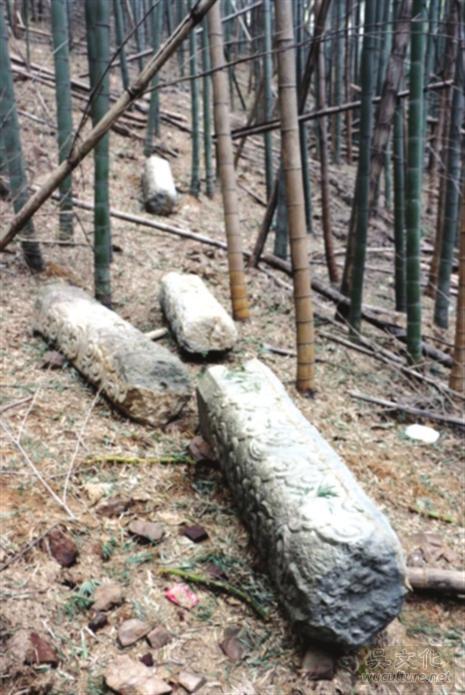 近日,我在吴山岭寻访时,在竹林深处发现一处古牌坊的遗迹,四根精美的云纹青石柱头。从现场推断:古牌坊原立于附近,坊柱和题刻横坊是可利用的石料,或被村民移走他用,柱头被遗弃于此。因发现地在半山腰,为墓坊的可能性最大。且离申时行墓较远,可排除牌坊是申墓附属。经查,吴山岭旧有元代陕西道监察御史孔希安墓、明代太子少保南京兵部尚书杨庄简公成墓、明代涿州同知吴文泰墓、明代顺天巡抚杨绳武墓及清代衡州府同知薛大训墓等。由于牌坊题刻部分已失,为谁所立成为待解之迷。