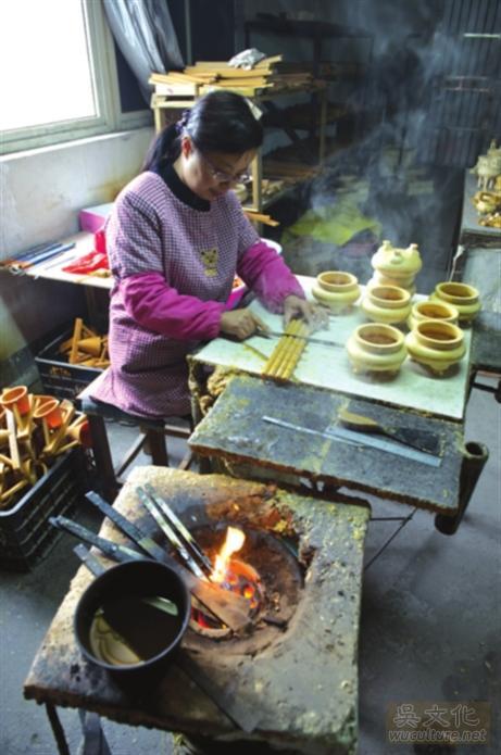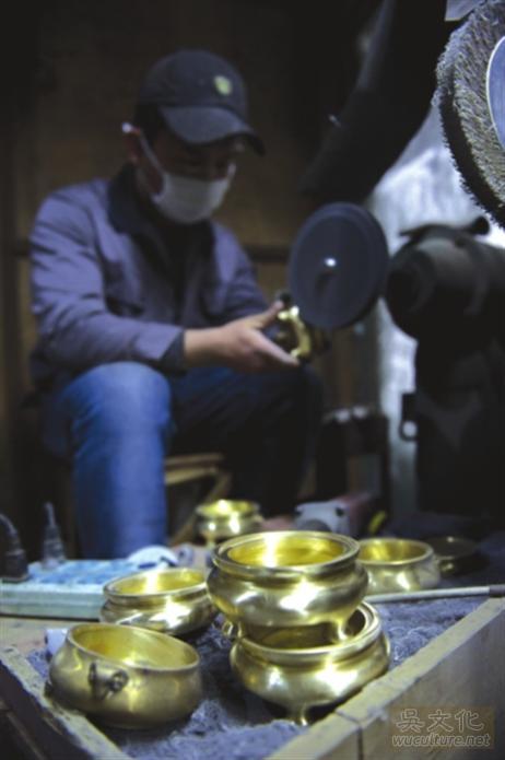 苏作工艺巧夺天工,最有名的要数刺绣、玉雕、核雕等,而苏州的铜器制作则少人闻之。在光福,有一位仿古铜器制作技艺非遗代表性传承人金全福。他凭着全手工制作和精细的风格,让苏州制作的铜器大放异彩。“这是一门古老的工艺,其工序多达十余种,每道工序都要细致把握,否则前功尽弃。”