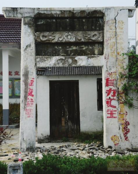 目前吴江尚站立未倒之古牌坊不过十处,独以此处未见任何记载。此坊双龙雕刻精细,两次涂抹纸筋书写红色标语的做法带有鲜明的时代特征,具有较高的文物价值,故而我们在清理时,对枋柱后没有题刻的标语也尽量保留。