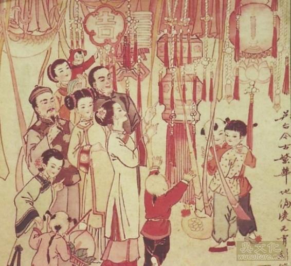 正月十五是一年之中第一个月圆之夜,元宵有张灯看灯习俗。苏灯自唐宋以来名闻天下,据宋周密《武林旧事》记载:“元夕张灯,以苏灯为最,圈片大者径三四尺,皆五色琉璃所成,山水人物花竹翎毛,种种奇妙,俨然著色便面也。”自宋以来,吴地元宵观灯成风,乡村民众年过后就急切等待苏州城中花灯上市,可以赶去一饱眼福,“吴台今古繁华地,偏爱元宵灯影戏;春前腊后天好晴,已向街头作灯市。叠玉千丝似鬼工,剪罗万眼人力穷;两品争新最先出,不待三五迎东风。儿郎种麦荷锄倦,偷闲也向城中看……侬家亦幸荒田少,始觉城中灯市好。”宋姜白石诗云:“元宵争看采莲船,宝马香车拾坠钿。风雨夜深人散尽,孤灯犹唤卖汤圆。”