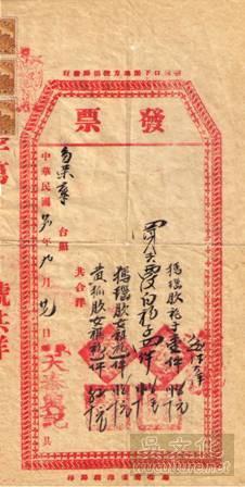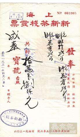 出具于建国后的1951年4月8日,上海新新茶栈开具的一用“苏州码子”标明花茶分别单价为〡〨千元,〢三千元和,〡三千元,二是用汉字小写落一九五一年四月八日,三是用汉字大写共计拾万零捌仟元,四是发票号码和税号用阿拉数字001005和4一137表示,再有一个罗马数就可称世界数码大全了。
