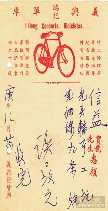 出具于香港庚年的义兴鸿纪单车行发票,使用“苏州码子”注明光头轮一个、 〧元,克细线九条、〩毛、计 〧元〩毛。