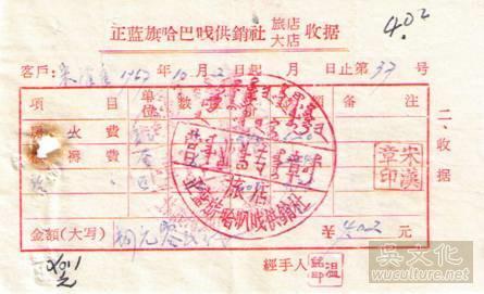 太仆寺旗贡布拉格车马店1967年10月8日发票左下方注明炮台芍子大店(苏州码子)〧元〢角〤分。
