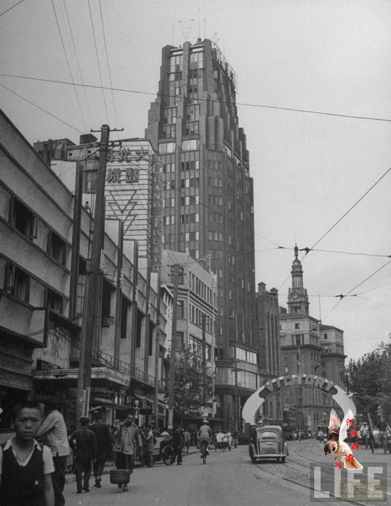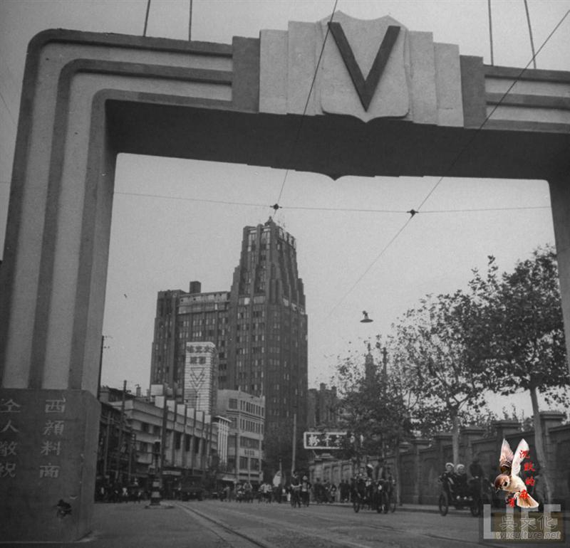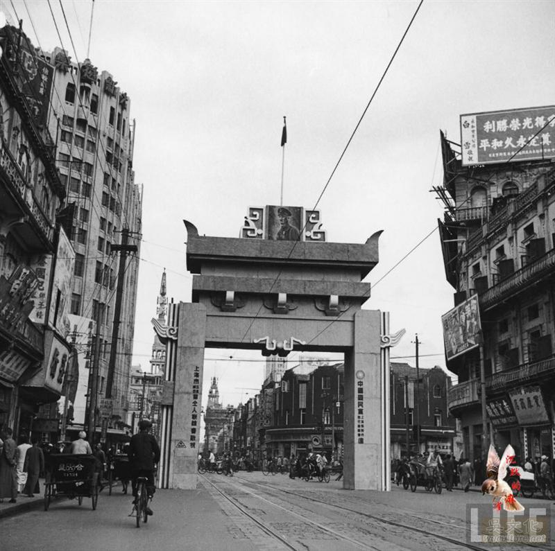 上海南京路沿线的交通,胜利牌坊和左边的大光明戏院及酒店。 |