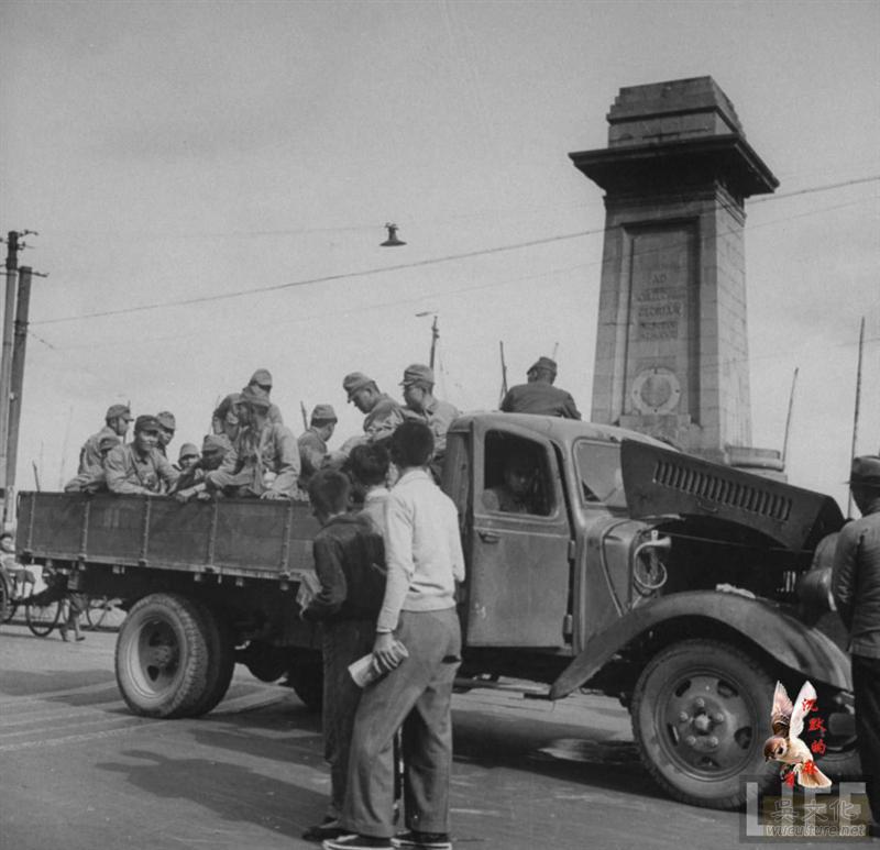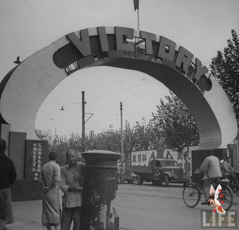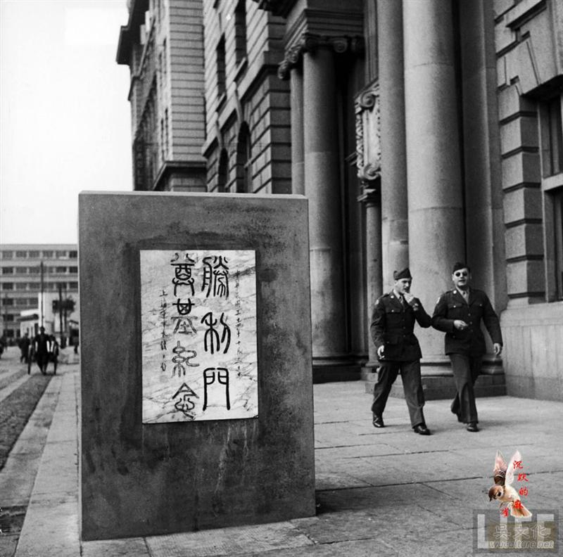 美军军人经过上海市市长题写的胜利门奠基纪念的石碑,这条街过去属于英租界,以前叫爱德华七世大道,二战后中华民国政府收回了除了香港澳门以外的租界,并去殖民地化将爱德华七世大道改名为中正路,“中正”是蒋介石的中文名字。 |