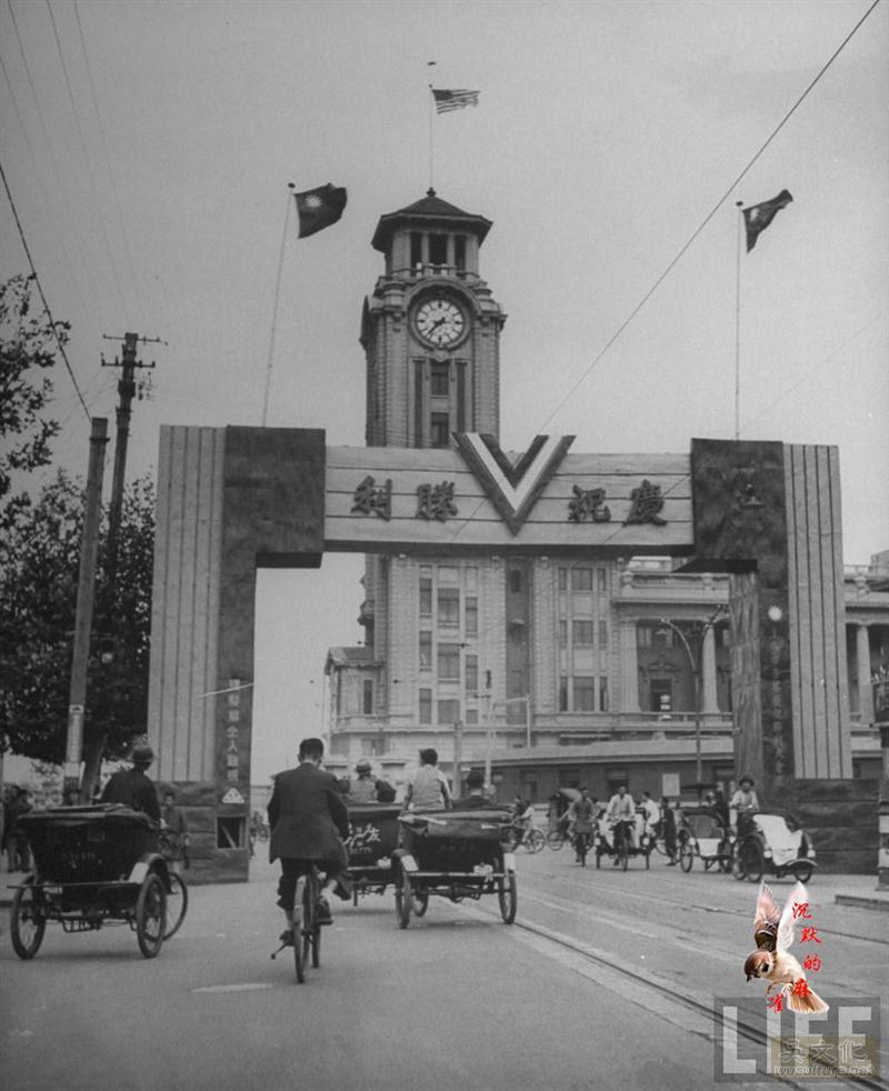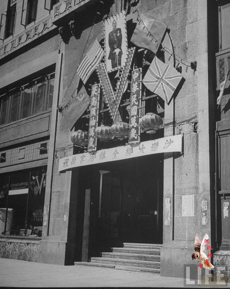 沙逊大楼大门抗战胜利装饰品,盟军旗帜和国民党蒋介石总司令的肖像。 |