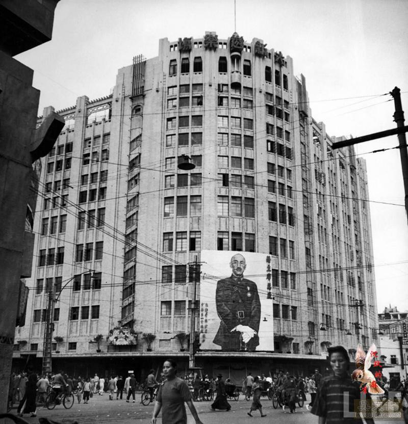 南京路和原虞洽卿路(西藏路)大光明百货公司的拐角处在墙壁上一个总司令蒋介石的大幅肖像。 |