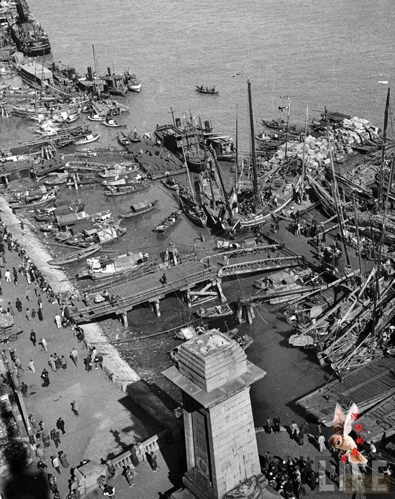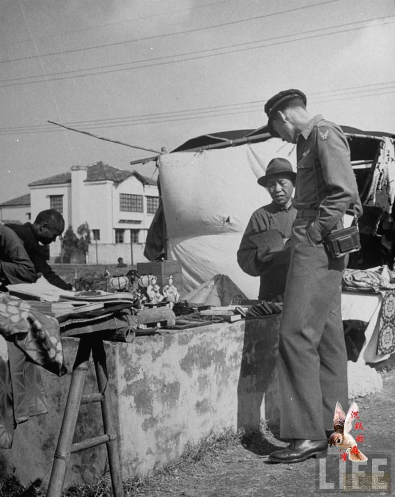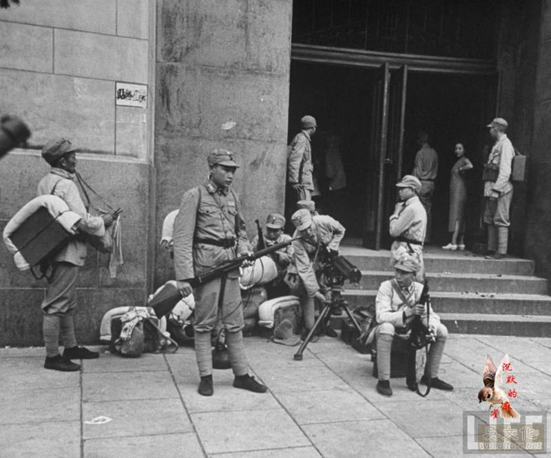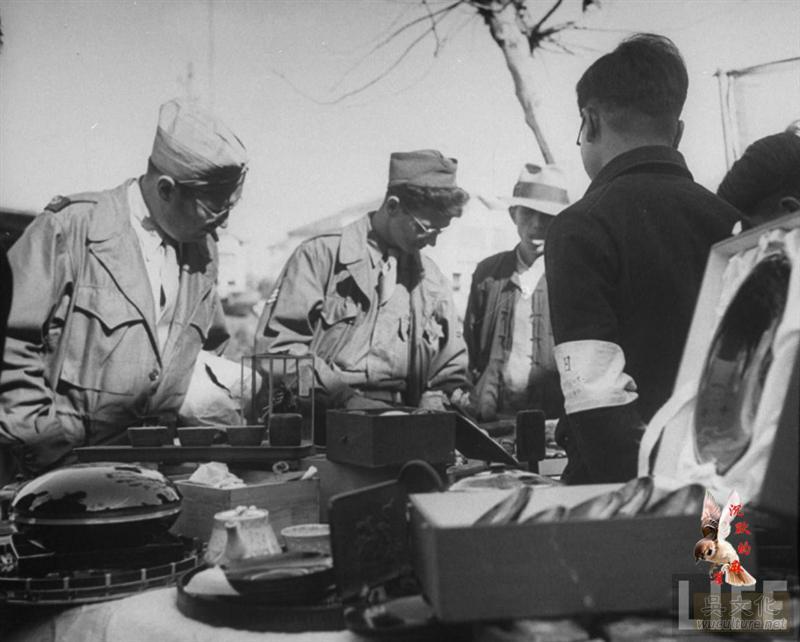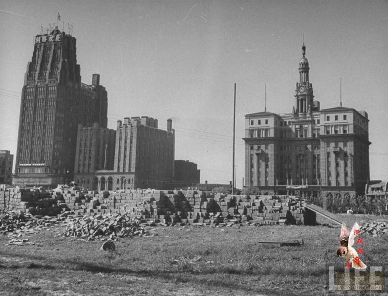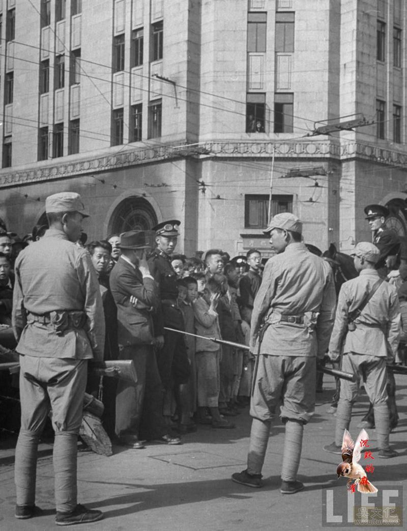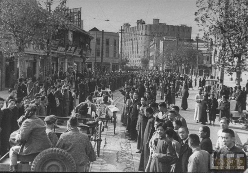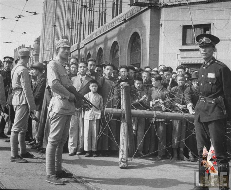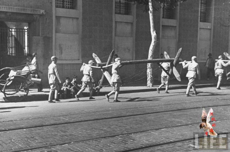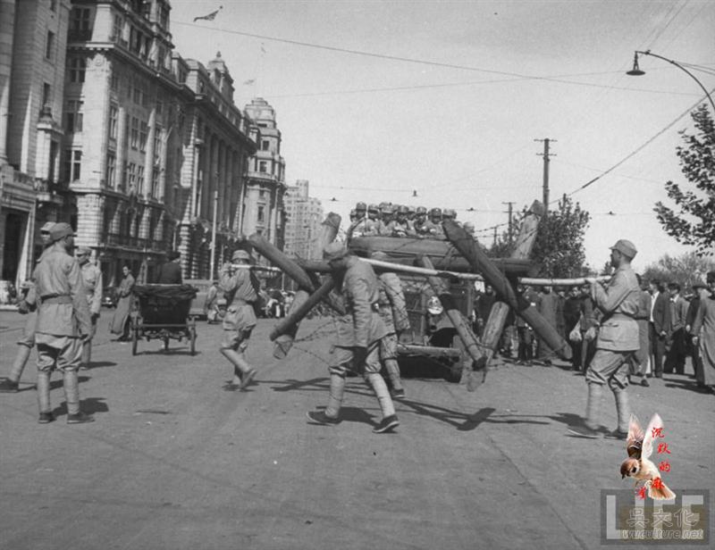 国军士兵清除在一个仪式上被用来隔离人群的铁丝网路障。上海 1945年12月 摄影师:乔治拉克丝 |