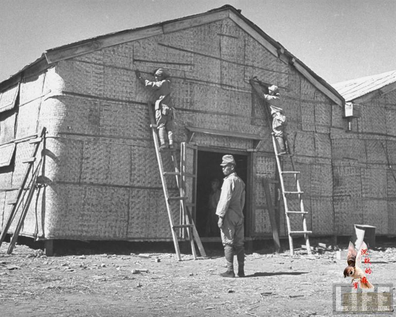 日本兵在他们自己的临时营地构建木制框架和苇席的营房 |