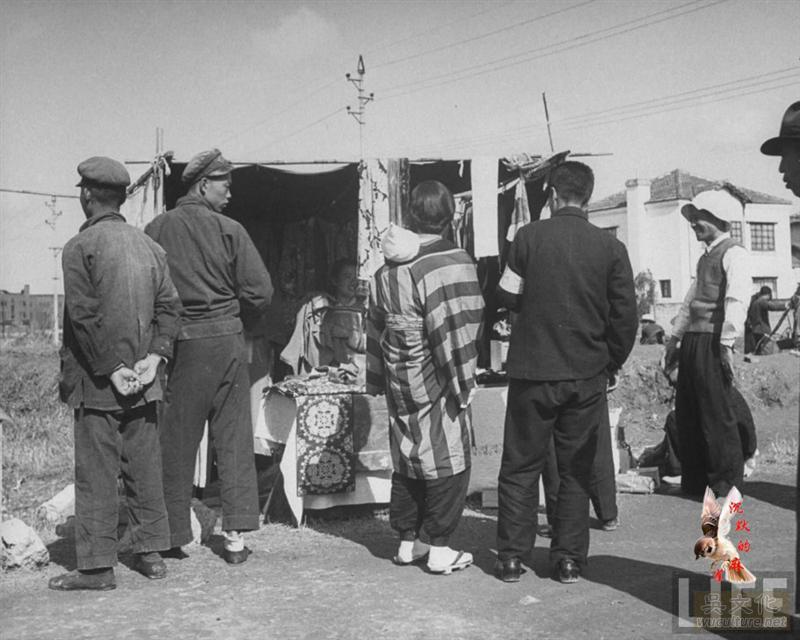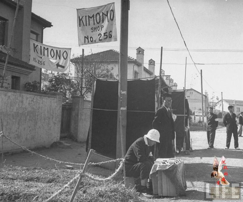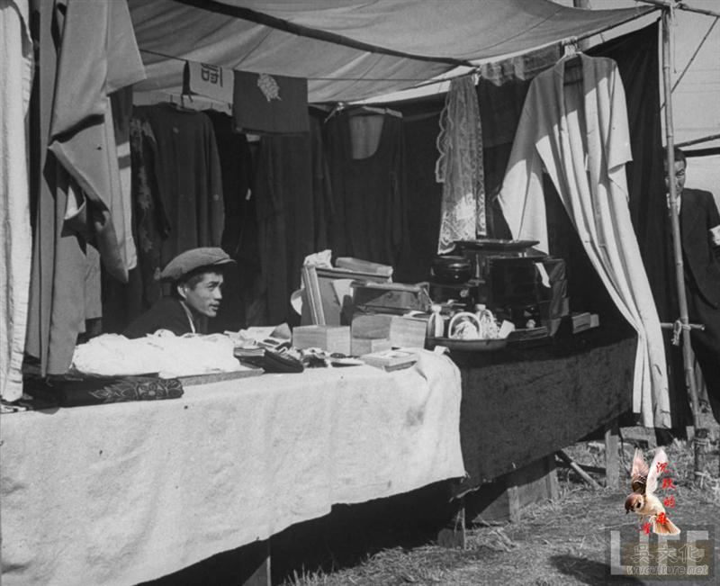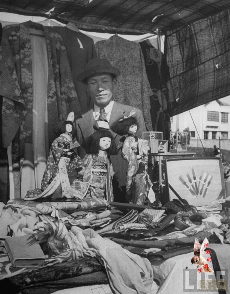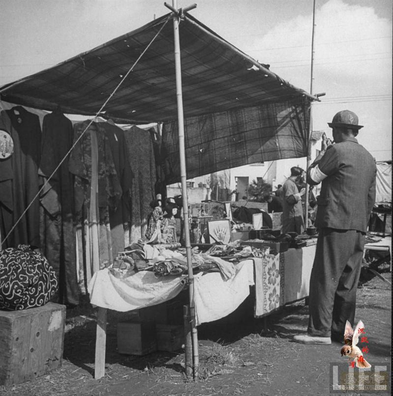 露天商店一名日本男子坐在桌子后面,销售他的和服和其他商品。 |