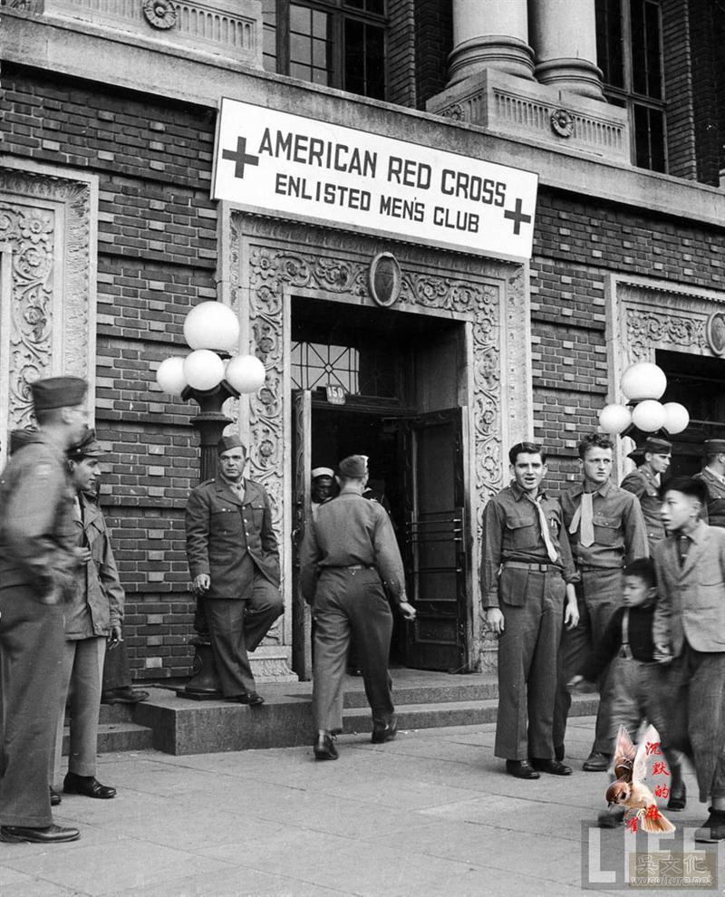 军人聚集在美国红十字会开办的士兵俱乐部,这是以前的浸礼会基督教女青年会建筑。上海. |