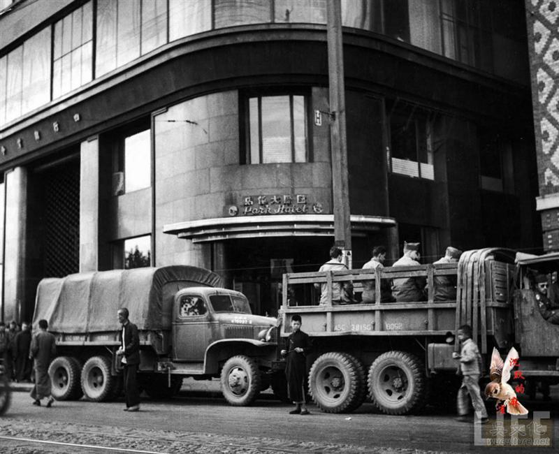 公园酒店外(国际大饭店)的运输卡车,美国陆军官兵驻扎在那里。 |
