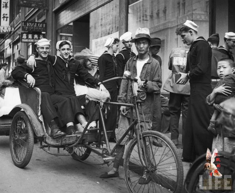 美国水兵在岸上坐在三轮车上,他们同伴在给他们拍照。 |