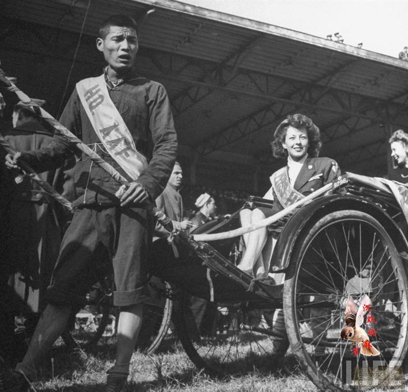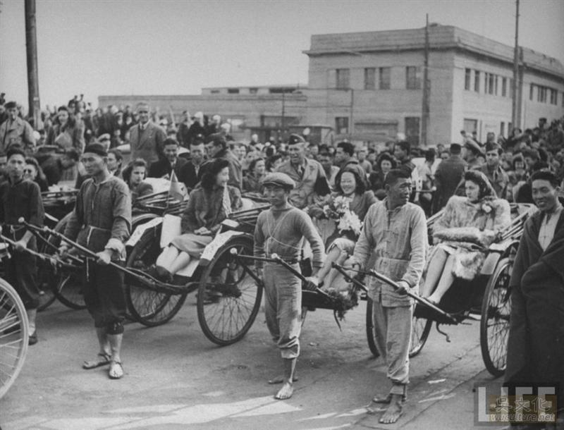 1945年11月,上海。为庆祝抗战胜利由市民组织的黄包车拉力大赛的参赛选手们 |