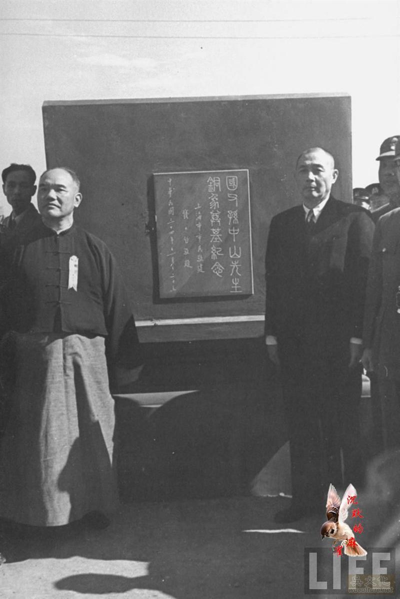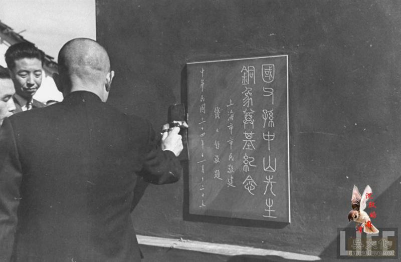 孙中山纪念碑落成仪式,铭牌是钱大钧题字 |