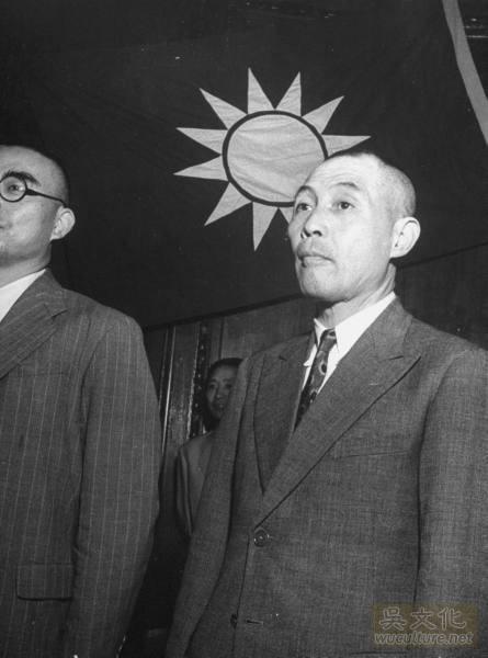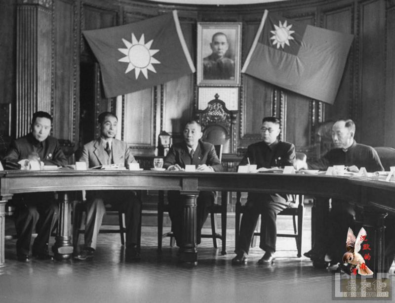 上海市长钱大钧(C)与政府各部门的负责人每周举行一次会议,背景国民党总理孙中山肖像和国民党党旗、中华民国国旗。 |