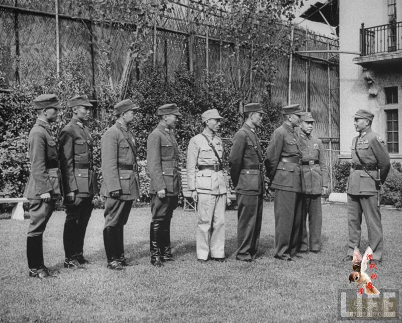 国民党军指挥官何应钦将军(R)在他家宽敞的花园和其他国军将领交谈 |