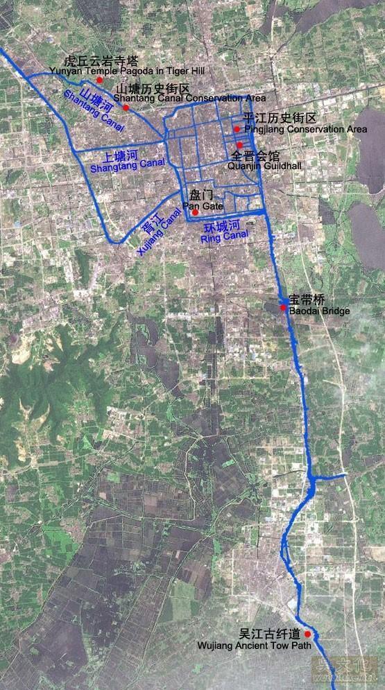 遗产点,包括山塘历史文化街区、虎丘云岩寺塔、平江历史文化街区、全晋会馆4个运河相关遗产,和盘门、宝带桥、吴江古纤道3个运河水工遗存。