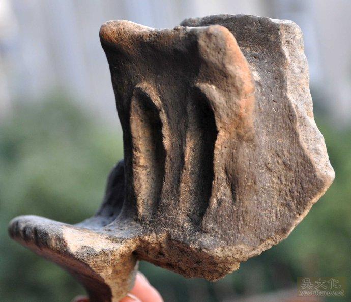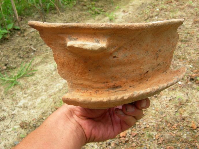 庵基墩去年挖沟带出的敝口、宽沿、双鋬釜沿的花边带剌扎手,夹粗砂烧制温度较高。