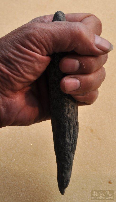 手持石耒石质:黑石燧石。长16.9、宽3.3、厚2.1cm,左端为鸭咀状刃部,刃呈园弧形,刃口尖利。全部打制,出土于无锡姚湾遗址。