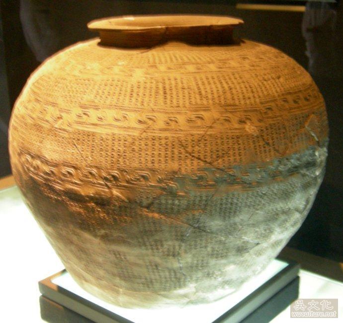 无锡博物院所藏展的几何纹硬陶瓮,纹飾接近我的藏品,高度较矮,无蘷龙纹饰,为残品拼粘修补而成。据称非无锡地区本土考古发掘。