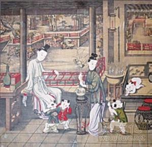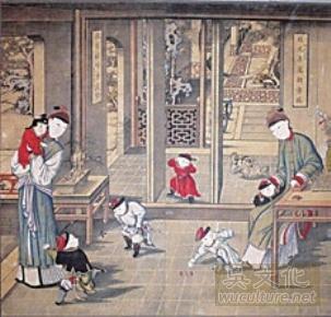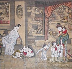 德国沃利茨宫廷花园,位于德国安哈尔特州一个叫德绍的地方。建于1769年至1773年,由利奥波德·弗里德里希·弗朗茨王子出资建造,是德国首座,也是至今世界上保存最好、最大的英国式庭园建筑,今为美术馆,联合国教科文组织公布为世界文化遗产。沃利茨城堡的“中国厅”共有两间12幅苏州版木刻年画作壁饰装潢。第一间分别是《苏堤春晓图》与《牛郎织女图》、《麒麟送子图》与《仕女育婴图》、《美女观花图》与《桌上婴儿图》,第二间分别是《白堤全景图》与《深宫秋兴图》、《把戏图》与《儿孙福禄图》、《姑苏万年桥图》与《聚宝盆图》。