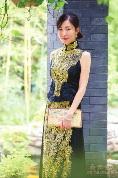 而那一款黑色与金色相拼的马甲裙套装甚合小编的心意,金色的羽毛绣出了隆重的感觉,款式上也算是改良的苏式旗袍吧。上半截马甲下摆处的褶皱,视觉上稍显复杂,很恰当地表现了复古元素。纯手工打造的刺绣以及高端的面料,每一处都体现了设计师的匠心独运。总之,低调的奢华,内敛的霸气都在这件衣服上得以体现,就像一首诗:“但愿韶光能永驻,人花相伴醉晨昏。御绣盘金绣画出一片花舞锦簇,伊人笑靥暮春,蹙金孔雀兆吉祥。”