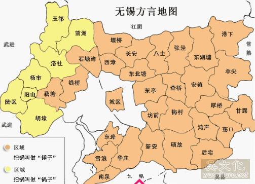 网络流传的无锡方言地图,其中“锅子”正是常州话的说法,位于东南的鸿声则是“苏州腔”的地盘。