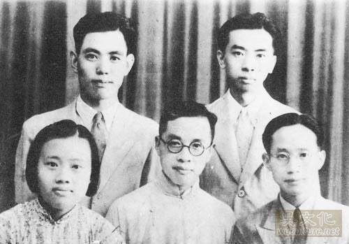 1940年钱伟长留学美国前与家人在上海合影(前排中为叔父钱穆,前排右为钱伟长)。