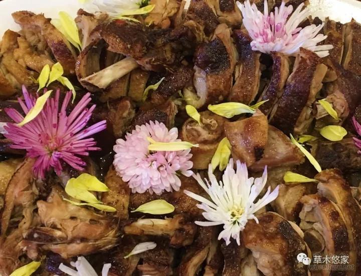 宋代美食家林洪功撰写的《山家清供》,“金饭”卷载:“采紫茎黄色正菊英,以甘草汤和盐少许焯过,候粟饭少熟,投之同煮。”让菊花的入馔普传民间。然不是所有的菊花都可以食用,所谓“真菊延龄,野菊泄人”,菊花性苦寒常会伤及脾胃,就是栽培菊,也不都是食用菊。可食的菊花多为白色、黄色,如‘白莲羹’、‘黄天赞’、‘梨香菊’等品种;极少量其他颜色的如粉色的‘延命乐’、紫色的‘北农紫菊’、橙色的‘宝华唐衣锦’、 红色的‘紫凤牡丹’,就是宝贵的食材了。菊的花作汤、涮火锅是最常见食法,而南京地区独特的菊花脑(Dendranthema indicum),食用的则是叶片,虽为栽培物,其实和野菊花同为一种。