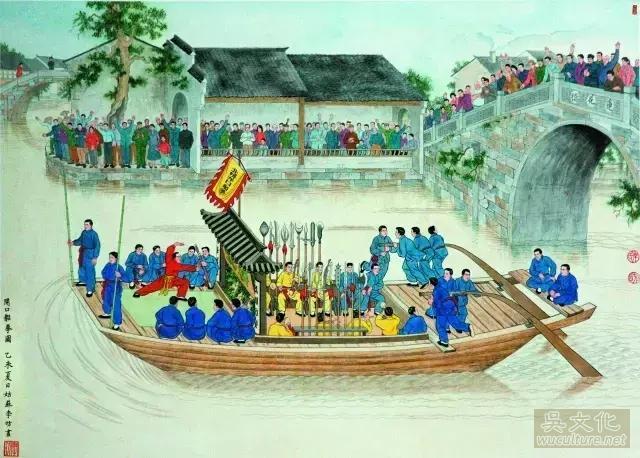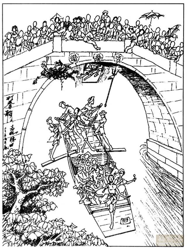 千年历史的水文化活动苏州船拳的最早产生可追溯到先秦时期,在唐代已有一定的活动市场。如苏州北桥的觉林寺庙会表演,船拳已是其中的主要内容之一。然而苏州江南船拳的真正发展并对社会发生影响力是从宋代开始的,特别是南宋时期。随着杭州南宋都城的建立,苏杭一带的水文化活动开展得如火如荼。苏轼《瑞鹧鸪•观潮》云:“碧山影里小红旗。侬是江南踏浪儿。拍手欲嘲山简醉,齐声争唱浪婆词。西兴渡口帆初落,渔浦山头日未敧。侬欲送潮歌底曲,尊前还唱使君诗。”