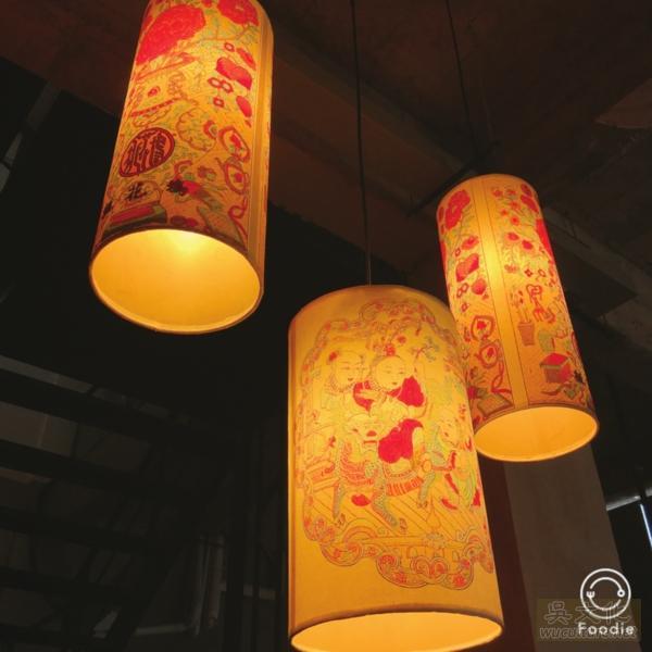 艺术馆内的天花板上悬挂着一组北欧风吊灯,白布灯罩上印的也是“一团和气”,中西合璧的设计风格令人耳目一新。