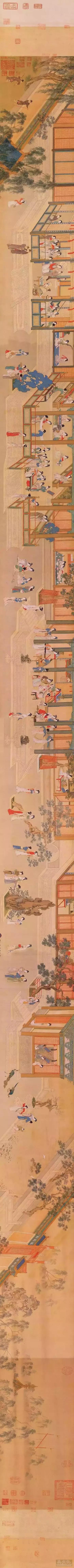 《汉宫春晓图》,中国重彩仕女第一长卷。绢本重彩,尺幅很大,37.2cm×2038.5cm,作为装饰性绘画来说属于巨制。汉宫春晓是中国人物画的传统题材,主要描绘宫中缤妃生活。[4]
