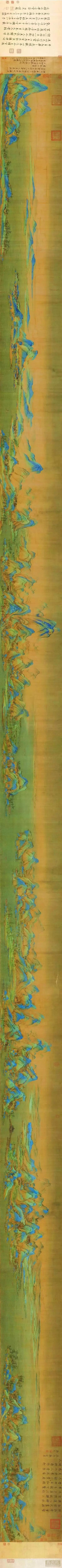 画中描写岗峦起伏的群山和烟波浩淼的江湖。依山临水,布置以渔村野市,水榭亭台,茅庵草舍,水磨长桥,并穿插捕鱼、驶船、行路、赶脚、游玩等人物活动。形象精细,刻画入微,人物虽细小如豆,而意态栩栩如生,飞鸟虽轻轻一点,却具翱翔之势。山石皴法以披麻与斧劈相结合,综合了南、北两派的特长。设色继承了唐以来的青绿画法,于单纯统一的蓝绿色调中求变化。用赭色为衬托,使石青,石绿颜色在对比中更加鲜亮夺目。整个画面雄浑壮阔,气势磅礴,充满著浓郁的生活气息,将自然山水,描绘得如锦似绣,分外秀丽壮美,是一幅既写实又富理想的山水画作品,是中国传统山水画中少见的巨制。卷后有当时蔡京的题跋,证明此画是真迹无疑。