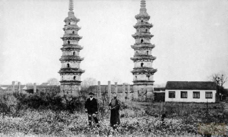 老照片是1905年左右,两位男士站在双塔前的田野里,拍照留影。