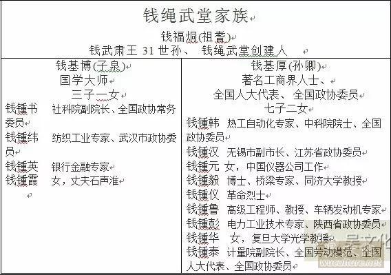 2、钱锺书及其宗族(无锡钱绳武堂)钱锺书的祖父钱福烔(祖耆,1849—1926年,武肃王31世孙)。他的前四代是钱奎、钱士镜、钱浩若、钱维桢。福烔是钱维桢第四子,按“福、基、锺、汝、昌”排辈下来,福炯曾娶江阴富豪孙氏女为妻。钱福烔共生有子女十一人,活到成年的止有长子钱基成(字子兰)、孪生的钱基博(字子泉)和钱基厚(字孙卿,以字行)兄弟三人。其中钱基成无后,钱锺书遂依祖父命被过继给他,直至钱基成病故,钱钟书才回到自己父母身边。