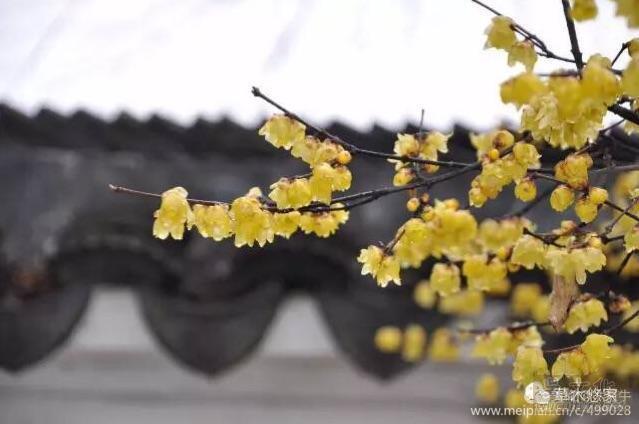 现在的江南,雪成了稀罕物,但蜡梅依旧年年开。苏轼曰:"天工点酥作梅花,此有蜡梅禅老家。蜜蜂采花作黄蜡,取蜡为花亦寄物。"蜡梅形似梅花,亮点却在"蜡","香气似梅,类女工捻蜡所成,因谓蜡梅。"当然这个"蜡"不是蜜蜂的杰作,但是那凝黄腻脂样的花瓣,实在是天工巧作,因而历代的诗家在吟咏蜡梅时,常在"蜡"字上下功夫。