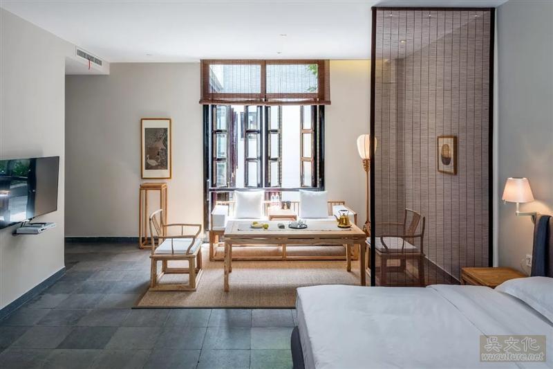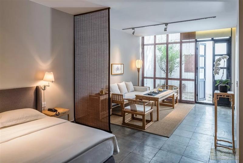 回廊雕栏逶迤而上,设计配色素朴典雅,动线以天井中庭为景,延伸至客房私享庭院;
