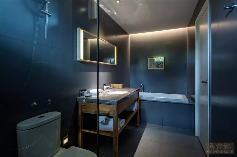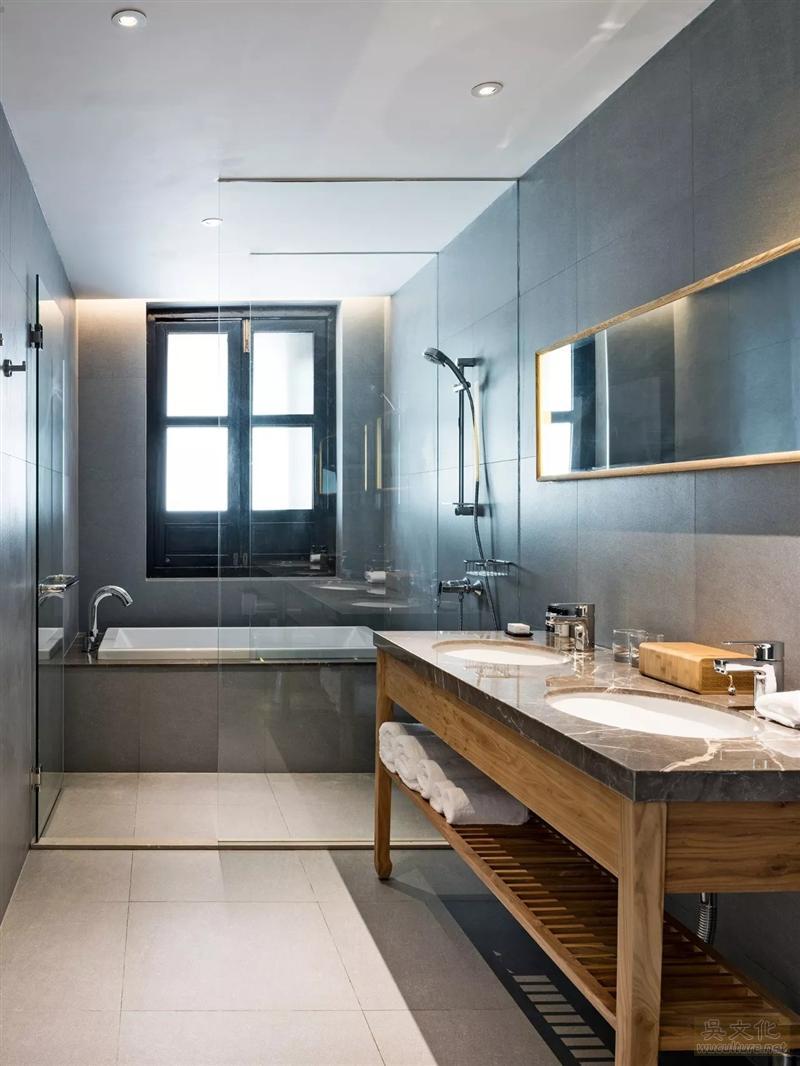 卫生间四周墙壁使用高雅灰色调瓷砖铺设,古典壁画和木材与大理石相间的盥洗台巧妙的将风格设定为现代与传统的结合体;