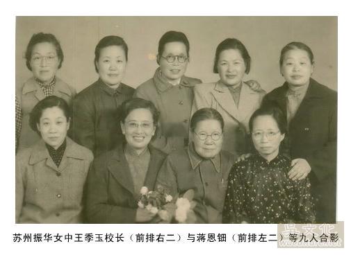 恩钿妹妹在太仓读完小学、初中后,准备女承父业,也去为五斗米折腰。可她的继母却感到很有才气的继女,读完初中就工作非常可惜,于是就冲破“女子无才便是德”的旧观念和当时女孩一般不读书的旧习惯,在蒋家家道开始中落的情况下,用自己的私房钱和让娘家人出钱,供恩钿妹妹到当时苏州很有名气的振华女中去读高中,于是,这里就开始出现了更精英的人物,我们的网也就开始向下联结了。