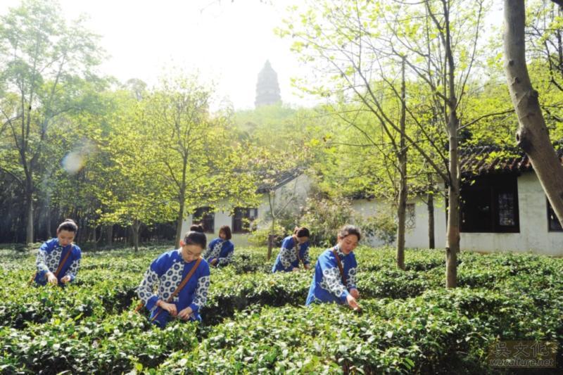昨天,一群身着江南水乡服饰的采茶姑娘在苏州虎丘山景区的茶园采茶。随着清明临近,景区内的春茶进入采摘期。