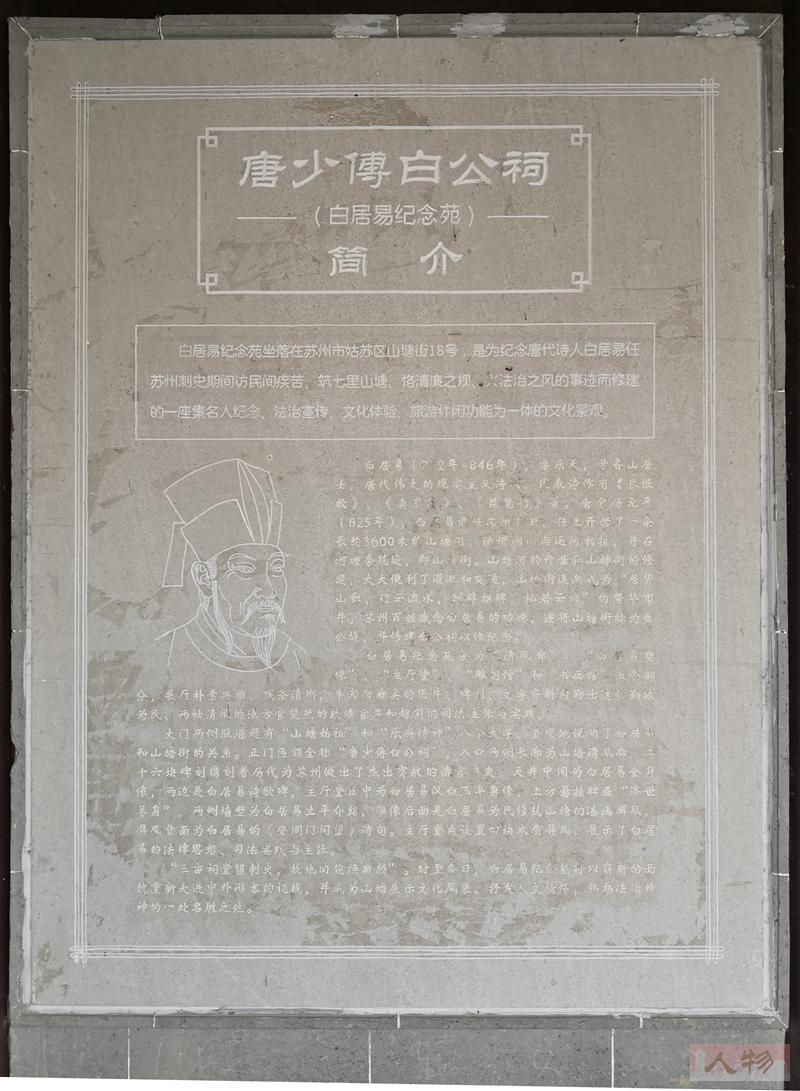 唐少傅白公祠位于苏州市姑苏区山塘街,是为纪念白居易担任苏州刺史时开凿了山塘河,使得阊门与运河相接,并在河塘旁筑堤,即山塘街。山塘街遂成“居货山积,行云流水,列肆招牌,灿若云锦”的繁华市井。苏州百姓感念白居易的功德,遂将山塘街称为白公堤,并修建白公祠以作纪念。