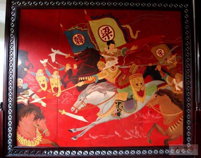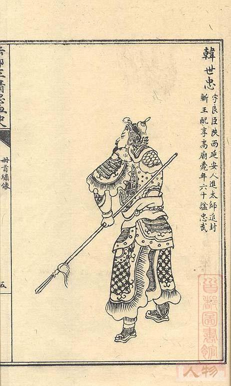 【韩世忠】(1089—1151) 宋绥德(今属陕西)人。字良臣。梁红玉夫。行伍出身。崇宁四年(1105 年),时抗击西夏有功,补进义副尉。转进勇副尉。宣和二年(1120年),曾以偏将参加镇压方腊起义。后在河北抗金建功。 钦宗即位(1125 年),河北总管司辟选锋军统制。以功历任果州团练使、单州团练使、嘉州防御使。康王即帝位,授光州观察使、带御器械,为御营左军统制。建炎二年(1128年)升定国军承宣使。迁鄜延路副总管,加平寇左将军,屯淮阳。三年率军到常熟、平江,入杭州拥戴高宗,领武胜军节度使,任御营左军都统制,为江浙制置使,授检校少保、 武胜昭庆军节度使。四年为浙西制使,守镇江,抗金获黄天荡大捷,为江南东西路宣抚使,置司建康。绍兴三年(1133 年)进开府仪同三司,充淮南东西路宣抚使,置司泗州。四年以建康、镇江、淮东宣抚使驻镇江,拜检校少师, 武成、感德军节度使,神武左军都统制,在大仪镇大败金与伪齐联军。晋少保。六年授武宁、安北军节度使,京东、淮东路宣抚处置使,驻楚州,除京东、淮东宣抚处置使兼节制镇江府,仍楚州置司,赐号扬武翊运功臣,加横海、武宁、安化三镇节度使。力请出师北伐,屡疏指斥主和误国。九年授少师。十年在淮阳大败金军,晋太保,封英国公,兼河南北诸路招讨使。十一年拜枢密使。抗疏反对宋金和议,为岳飞鸣冤,罢职奉祠。于苏州赐第宅。封福国公,改潭国公。十三年封咸安郡王。十七年改镇南、武安、宁国节度使。卒后,孝宗追封蕲王,谥号忠武,于苏州灵岩山赐建墓祠。