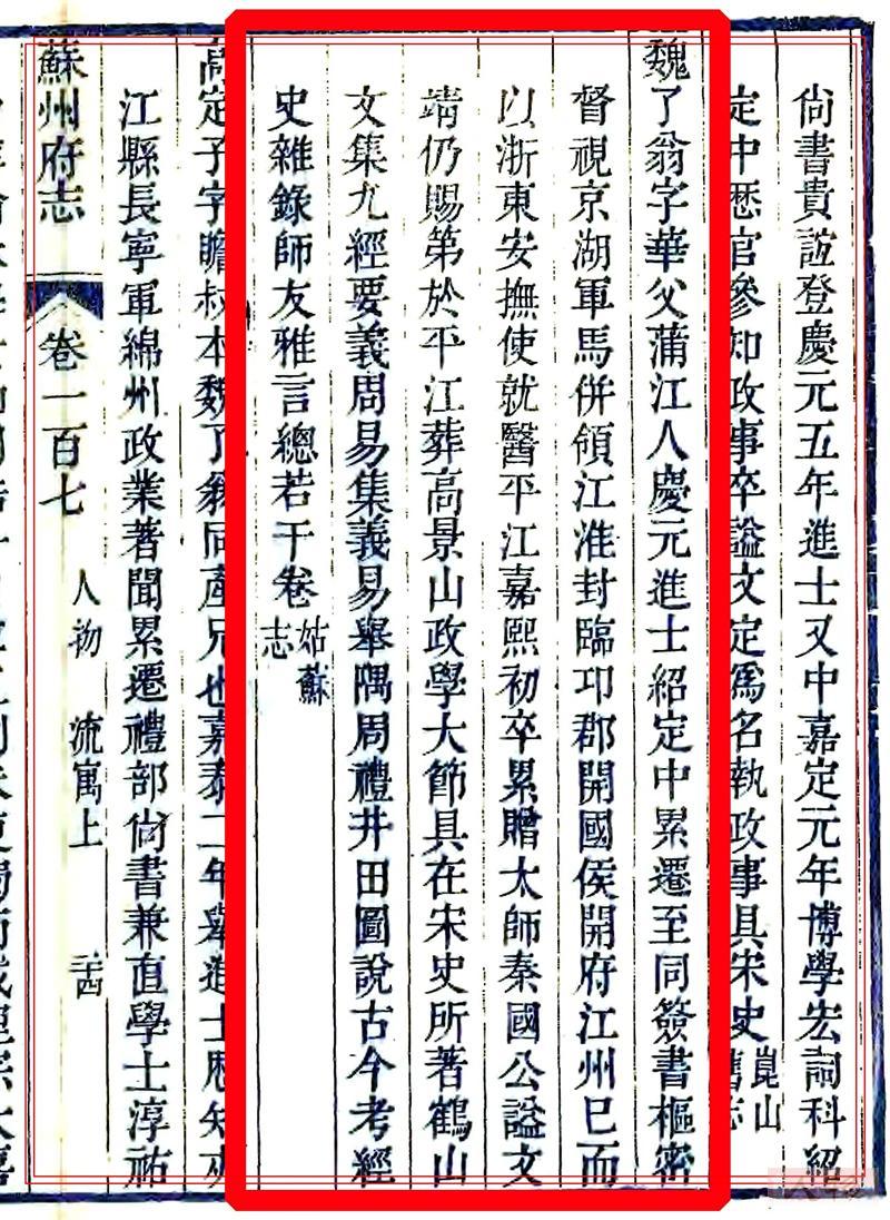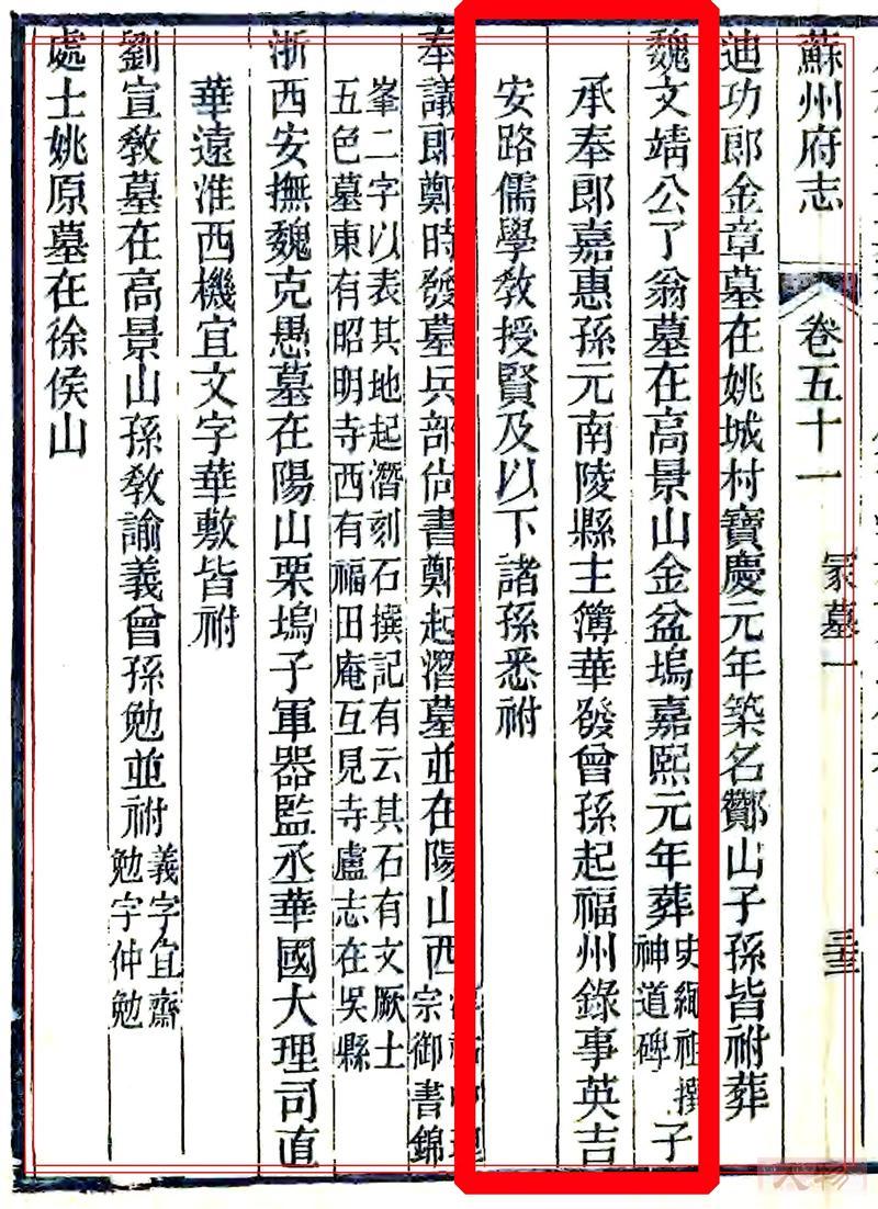 清道光《苏州府志》:“魏文靖公了翁墓,在高景山金盆坞。嘉熙元年(1237)葬,史绳祖撰神道碑。” |