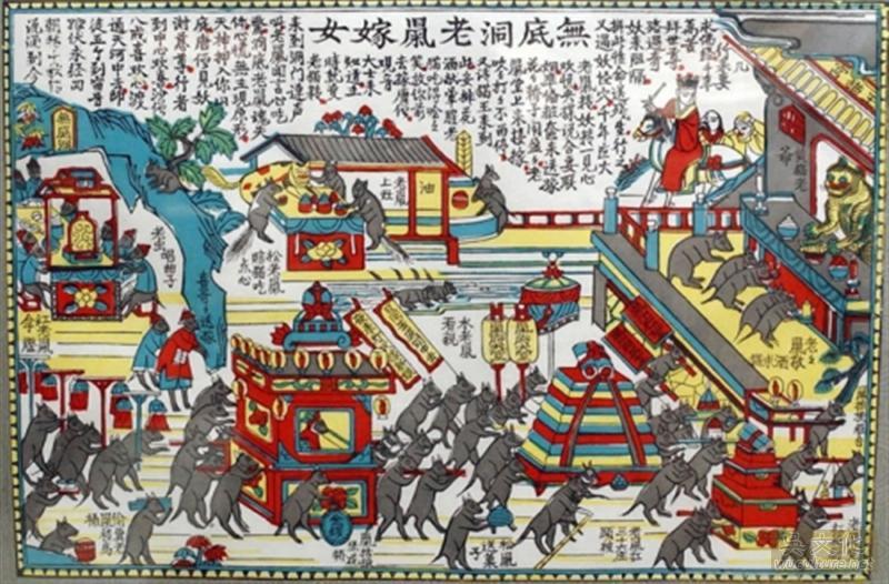 桃花坞年画《老鼠嫁女图》场面宏大,刻工和设色极具技巧