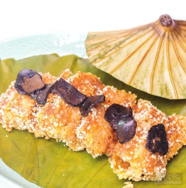 这道菜中最独特的就是这个“粉”,使用超过2种以上的不同大米,由餐厅厨师自己经过打磨并加入香料进行炒制,是标准的自制米粉。这样的自制,首先有了品质保证,其次有了特色风味,显然不是超市售卖的大路货了。肉类则选用苏太猪的猪腩肉(肥瘦相间),肉质鲜美而少肉臊之气,再加入了黑松露提升美味、最后配上荷叶的清香,那将是一种何等的味觉享受!肉是方方正正的肉片,头顶荷叶的华盖,揭盖而起的时候,香气便四溢开来。连着黑松露咬一口,菌的鲜香、米粉的脆香、肥腴的肉香一起裹挟而来,最美妙的是,肉香里还泛出一缕苏州人都熟悉并亲切的白豆蔻、丁香之类的酱肉之香,一代又一代苏州人吃惯了这样的肉香,对于这份隐隐的香尤其刻骨铭心。要说中餐香料调味与东南亚香料的差异,我想,前者是优雅而隐居的,后者却是冲在最前方的斗士,刚猛而浓烈。