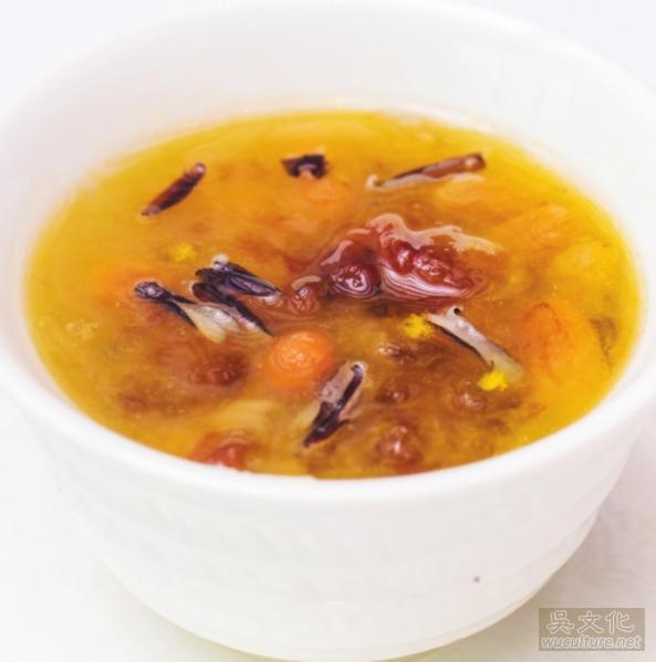 这是一份中式甜品,现在不管是中餐还是西餐,几乎都会有餐后甜品。这道甜品的灵感,据说来自于太湖十景,选取食材时,充分体现了天时、地利之便——精选此季的镇湖黄桃及桃胶,另加上葡萄干、紫米、谷类等十种食材,用藕粉调制出的冷汤甜品。