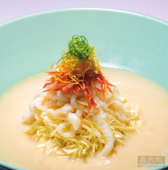 如果你热爱淮扬经典菜“大煮干丝”,那么这道菜可以说是它的升级豪华版——选用鳜鱼鱼骨、鱼柳熬制的浓汤,鲜味可想而知。出锅之后,鱼柳与茭白丝的搭配,再用金华火腿丝作为点缀,不仅好看更是提升了菜品整体的味道。这道菜不仅看着清爽,口味清香,而且鱼汤浓白,极富营养,老少孕弱都很相宜。